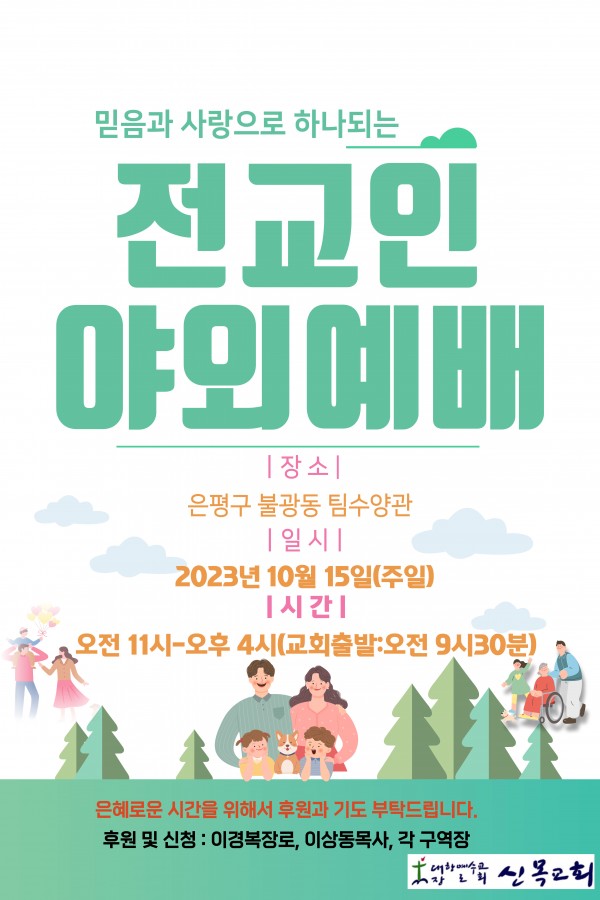 신목앨범 2023년 신목교회 전교인 한마음 야외예배 작성자신목교회 등록일 23-09-21 조회4,806회 이름신목교회 본문 2023년 신목교회 전교인 한마음 야외예배를 계획 중에 있습니다. 기도와 후원부탁드립니다. 댓글목록 댓글목록 등록된 댓글이 없습니다. 2023 신목교회 한마음 야외예배1 2023 신목교회 교회학교 여름성경학교, 수련회 목록