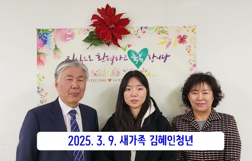2025.3.9 새가족 김혜인청년 작성자신목교회 등록일 25-03-18 조회360회 이름신목교회 본문 사랑하고 축복합니다. 2025. 4. 20일 새가족 장경철성도 김경숙성도(정연경집사인도) 2025.1.26 새가족 전지웅성도 목록